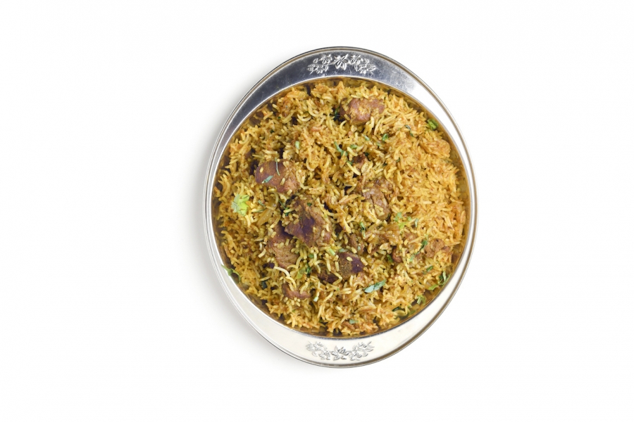 Riz basmati sauté avec des morceaux d'agneau, oignons épices & garni de coriandre